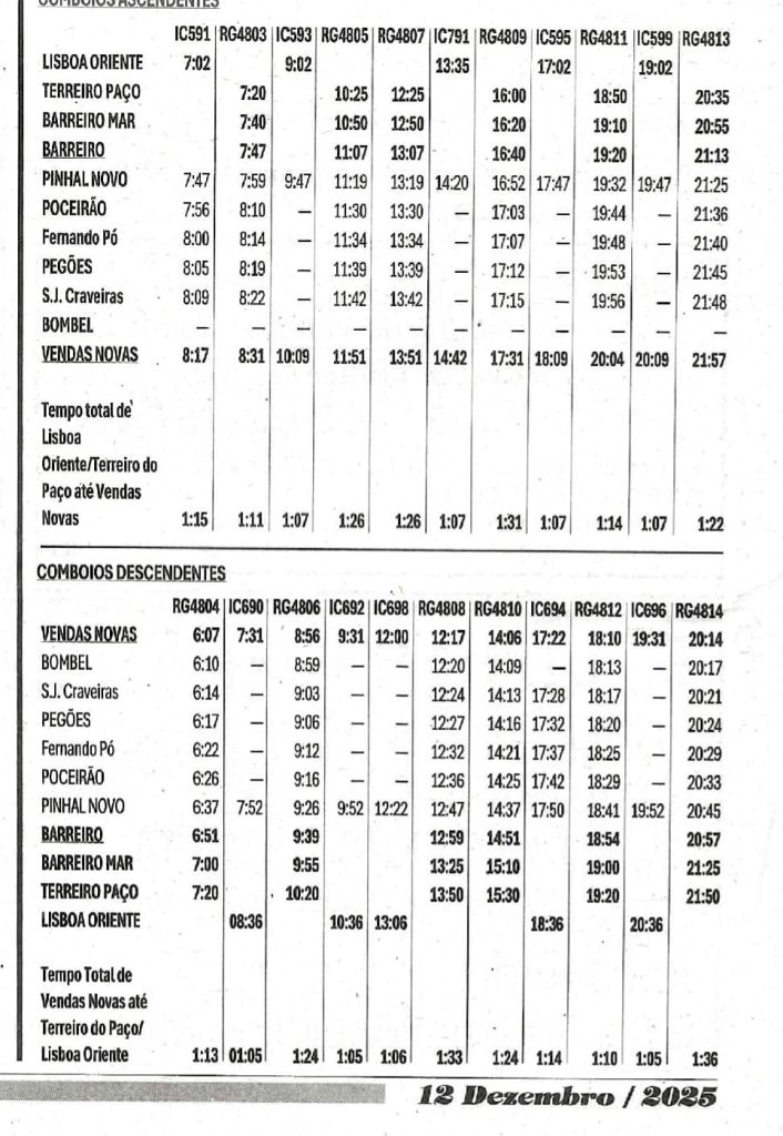 | VENDAS NOVAS | 6:07 | 7:31 | 8:56 | 9:31 | 12:00 | 12:17 | 14:06 | 17:22 | 18:10 | 19:31 | 20:14 |